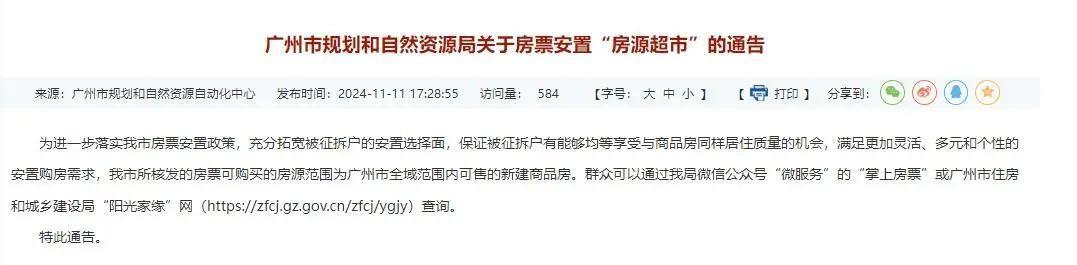 11月11日,广州市接洽和当然资源局发布《对于房票安置“房源超市”的晓谕》,指出:广州市所核发的房票可购买的房源界限为广州市全域界限内可售的新建商品房。民众不错通过微信公众号“微服务”的“掌上房票”或广州市住房和城乡开拓局“阳光家缘”网查询。